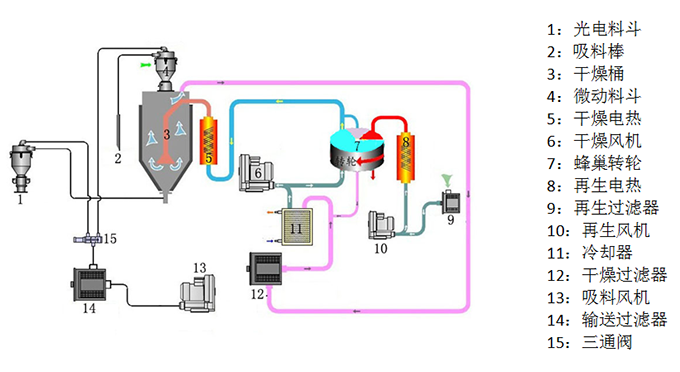 –、干燥除濕部分:從干燥料桶回來(lái)的濕熱空氣經(jīng)冷卻,吹入蜂巢轉(zhuǎn)輪.空氣中的水分被轉(zhuǎn)輪吸附,然后又被再生加熱空氣所脫附.兩股氣流同時(shí)作用在轉(zhuǎn)輪上,并隨著轉(zhuǎn)輪的轉(zhuǎn)動(dòng),使得空氣中的水分連續(xù)不斷的被吸附又被再生空氣所脫附而排出,就形成穩(wěn)定的低露點(diǎn)空氣,經(jīng)加熱到塑膠的干燥溫度,吹入干燥料桶內(nèi),形成密循環(huán),干燥原料.