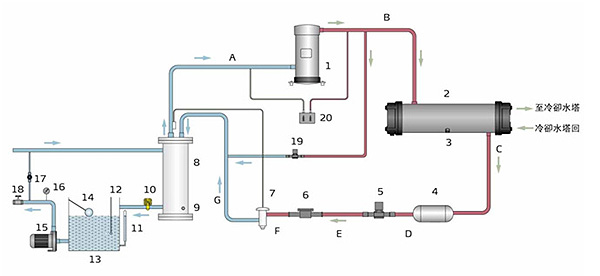 →RCM- W系列冷水機(jī)啟動(dòng)后,壓縮機(jī)1開始運(yùn)轉(zhuǎn),制冷劑在壓縮機(jī)的作用下變成高溫高壓氣體,往BC方向運(yùn)行,進(jìn)入冷凝器2與冷卻水進(jìn)行熱交換后變?yōu)橐簯B(tài),熱量被冷 卻水帶走;C-D-E-F過程,從冷凝器中出來的液態(tài)制冷劑經(jīng)過干燥過濾器4,干燥、過濾雜質(zhì)后通過液管電磁閥5、視液鏡6后到達(dá)膨脹閥7,F(xiàn)-G過程 中,高壓液體制冷劑通過熱力膨脹閥節(jié)流降壓后,溫度降低;G-A過程中,低溫低壓制冷劑經(jīng)過蒸發(fā)器8與冷凍水發(fā)生熱交換,將冷凍水冷卻至設(shè)定溫度;經(jīng)蒸發(fā) 后的低溫氣態(tài)制冷劑返回至壓縮機(jī)1,如此循環(huán),達(dá)到冷卻效果。